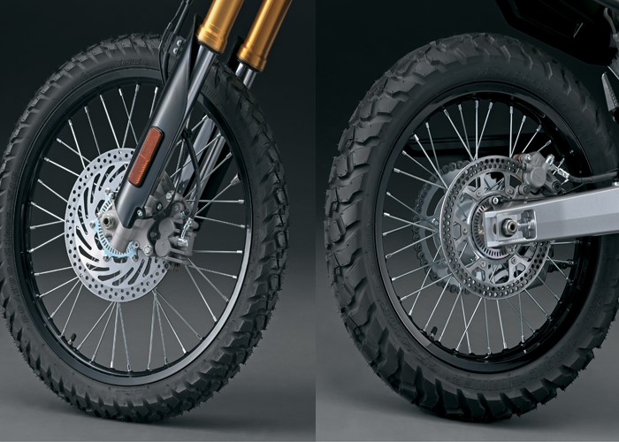 ล้ออลูมิเนียมซี่ลวด ล้อหน้าขนาด 21 นิ้ว และล้อหลังนาด 18 นิ้ว ยางจาก IRC มาพร้อมดิสก์เบรกทั้งหน้าและหลัง