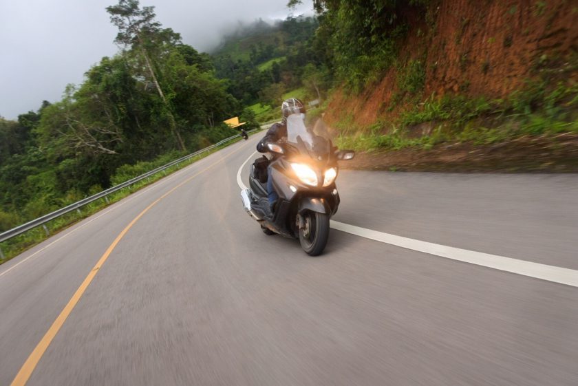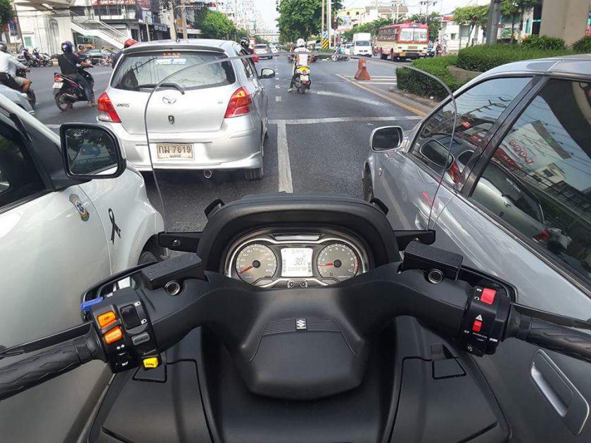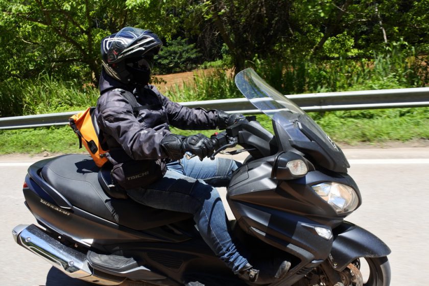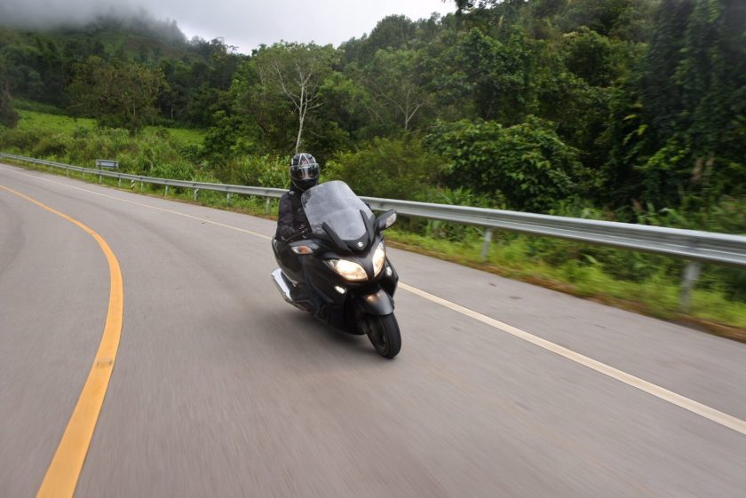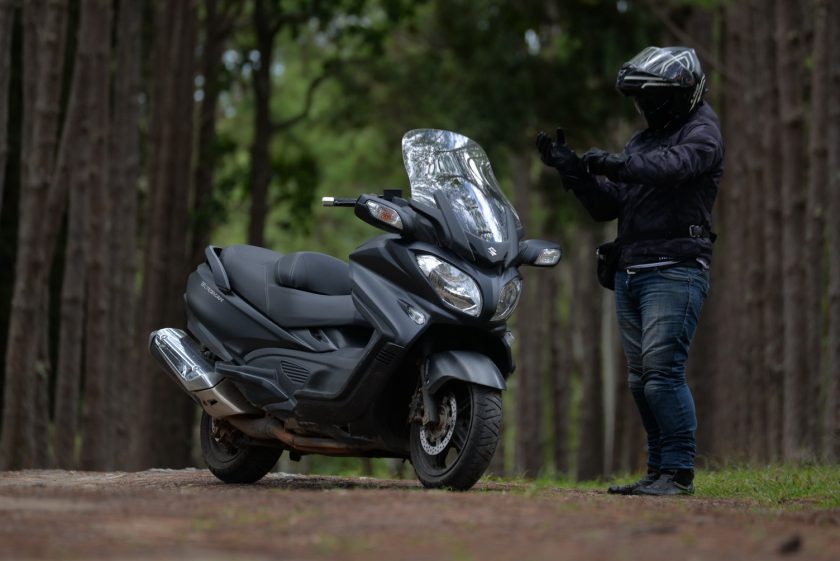 [ความรู้สึกในการขับขี่] ด้วยจุดศูนย์ถ่วงของตัวรถที่วางน้ำหนักไว้อยู่ต่ำ และมีความสูงใต้ท้องรถเพียง125มม.(เตี้ยกว่าBURGMAN 200 อยู่ 5มม.) การเข้าโค้งเมื่อคุ้นเคยกับตัวรถดีแล้วจะพบว่ามันเข้าโค้งได้สนุกและยึดเกาะดีเกินคาด แม้น้ำหนักรถพร้อมของเหลวจะอยู่ที่ประมาณ 275 กิโลกรัม แต่เมื่อคร่อมขี่แล้วลองเอาขายันแล้วไถหน้าไถหลัง ยังเป็นน้ำหนักที่คนที่แข็งแรงทั่วๆไปประคองเคลื่อนที่ได้ และเมื่อบิดคันเร่งออกตัวไป น้ำหนักดังกล่าวก็แทบไม่รู้สึกว่าหนักและเป็นภาระเลย