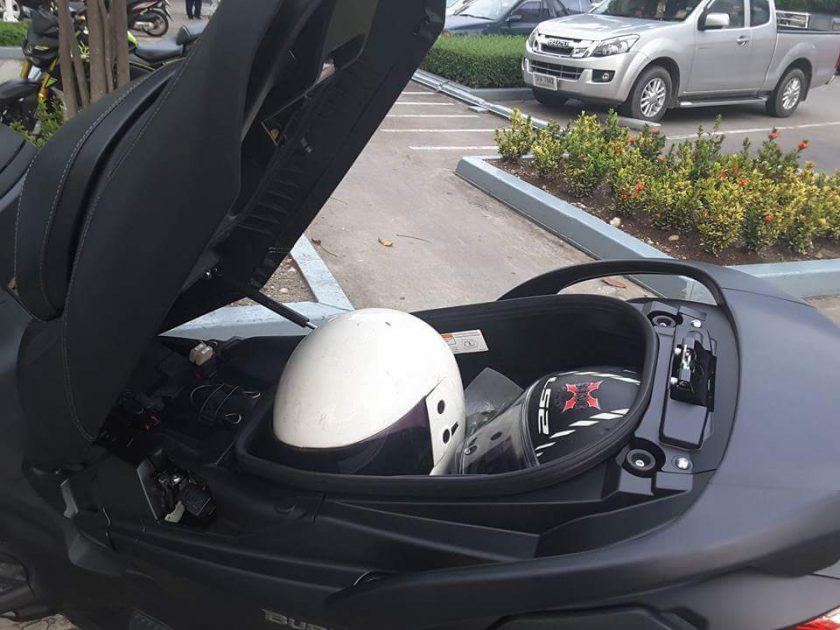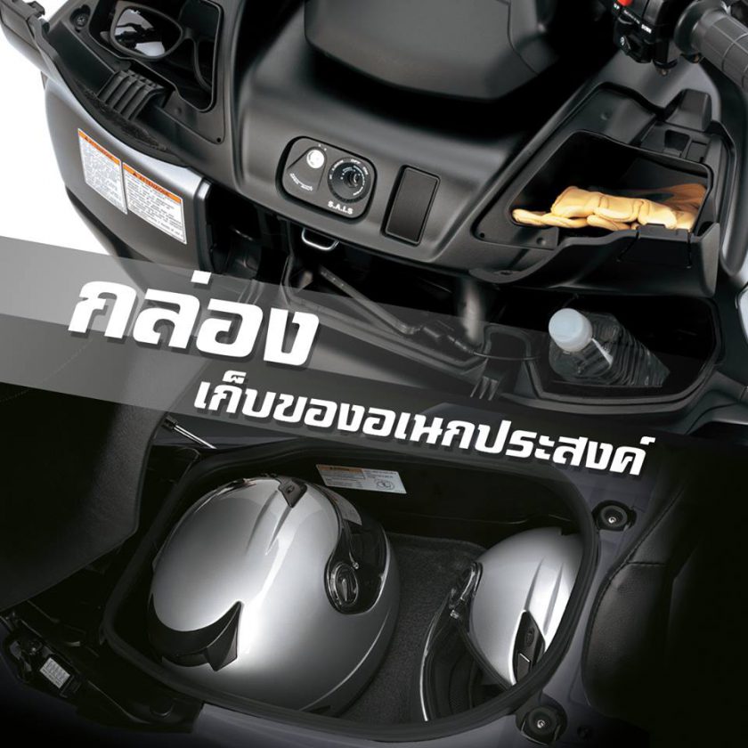 ช่องเก็บของใต้เบาะความจุ 50 ลิตร จัดเรียงสัมภาระได้จุใจ ใช้งานในเมืองเวลาจอดก็เอาหมวกกันน๊อคเต็มใบปิดคางใส่ลงไปได้สองใบก็ยังมีที่เหลือๆ ช่องเก็บของด้านหน้าคนขี่ก็มีอีกสามช่องให้ใส่ของเล็กๆน้อยๆ เช่น แว่นตากันแดด ถุงมือ บลาๆๆ ฯลฯ มี DC Socket ให้เสียบตัวชาร์จไฟแบบเสียบกับที่จุดบุหรี่ได้ด้วย(ขอจิ๊กรูปจากเพจไทยซูมาใช้หน่อย อิอิ)