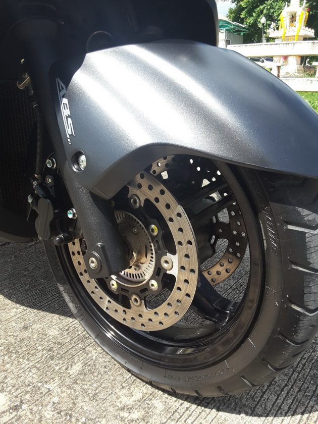 [ช่วงล่าง] ระบบกันสะเทือนช่วงหน้าที่เรียบง่ายด้วยเทเลสโคปิคระยะชักที่ 110มม. กันสะเทือนหลังด้วยโช๊คอัพคู่ปรับพรีโหลดได้ 5 ระดับมารับแรงสะเทือนระหว่างเฟรมกับสวิงอาร์มระยะยุบตัวที่ 100มม. หยุดล้อหน้าด้วยดิสค์เบรคคู่ และดิสค์เดี่ยวในเบรคหลัง แน่นอนว่ามาพร้อมกับ ABS ยางหน้าและยางหลังติดรถ ให้ของดีติดตัวมาเป็น Bridestone Batlax ปั้มนูน Made in Japan ล้อหน้าขอบ 15นิ้วพร้อมยางขนาด 120/70 และล้อหลังขอบ 14นิ้ว พร้อมยางขนาด 160/60